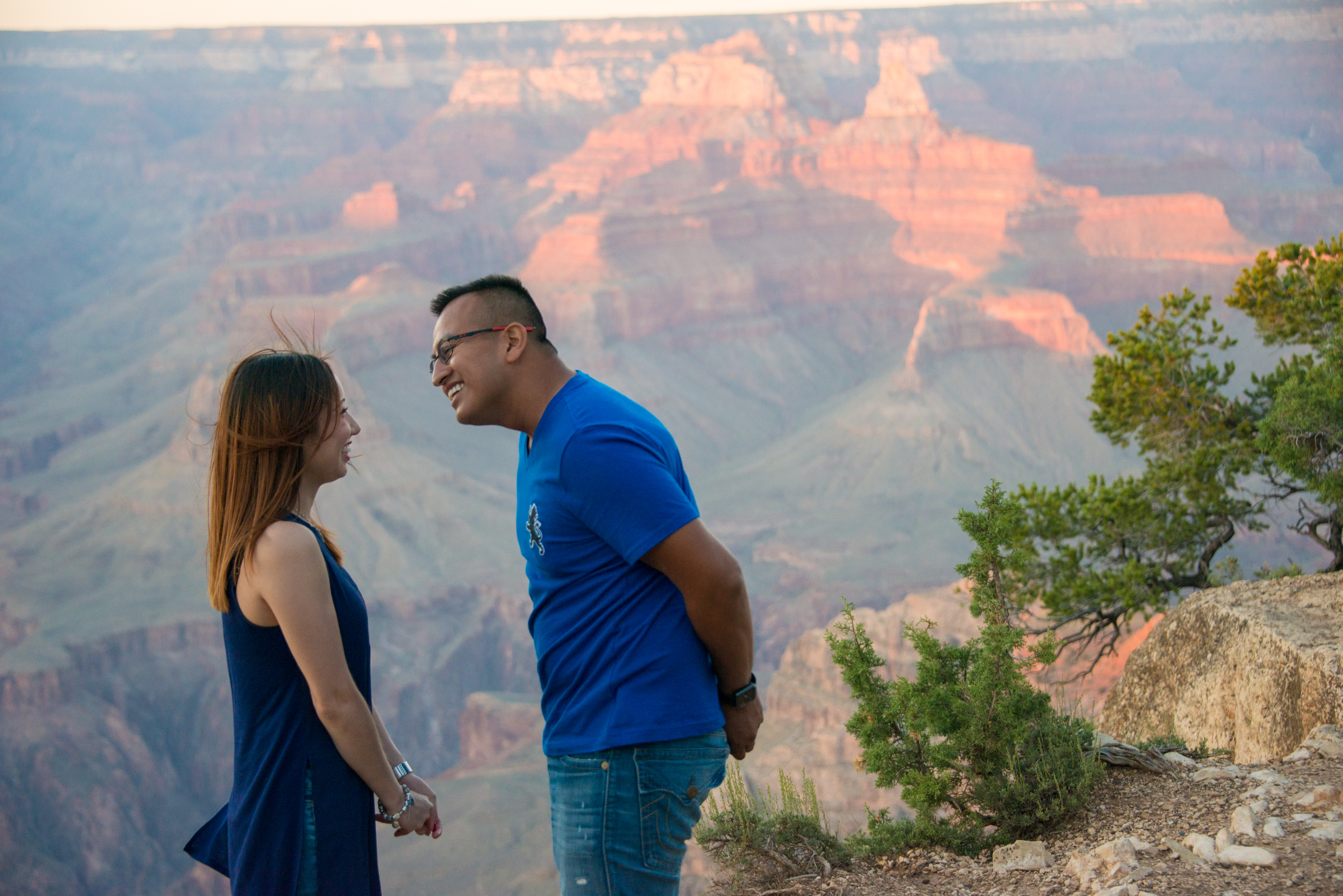 I absolutely love shooting engagement proposals in the moment at Grand Canyon. It isn’t always easy to communicate exactly how it will look or when it will take place until it’s really happening. I am truly honored to be able to witness these magical engagement proposals as they are happening. Juan and Jessica’s engagement took place near the Yavapai Geology Museum. Although Jessica was aware that we would be taking photos, she had no idea what other surprises she might encounter. We took many photos and then Juan held both her hand and looked right into her eyes … it was happening. They spoke Spanish to each other and I didn’t know what they were saying but I didn’t need to. The way that they looked at each other and the ton of Juan’s voice said it all. He proposed and I am truly glad to be a part of this event.