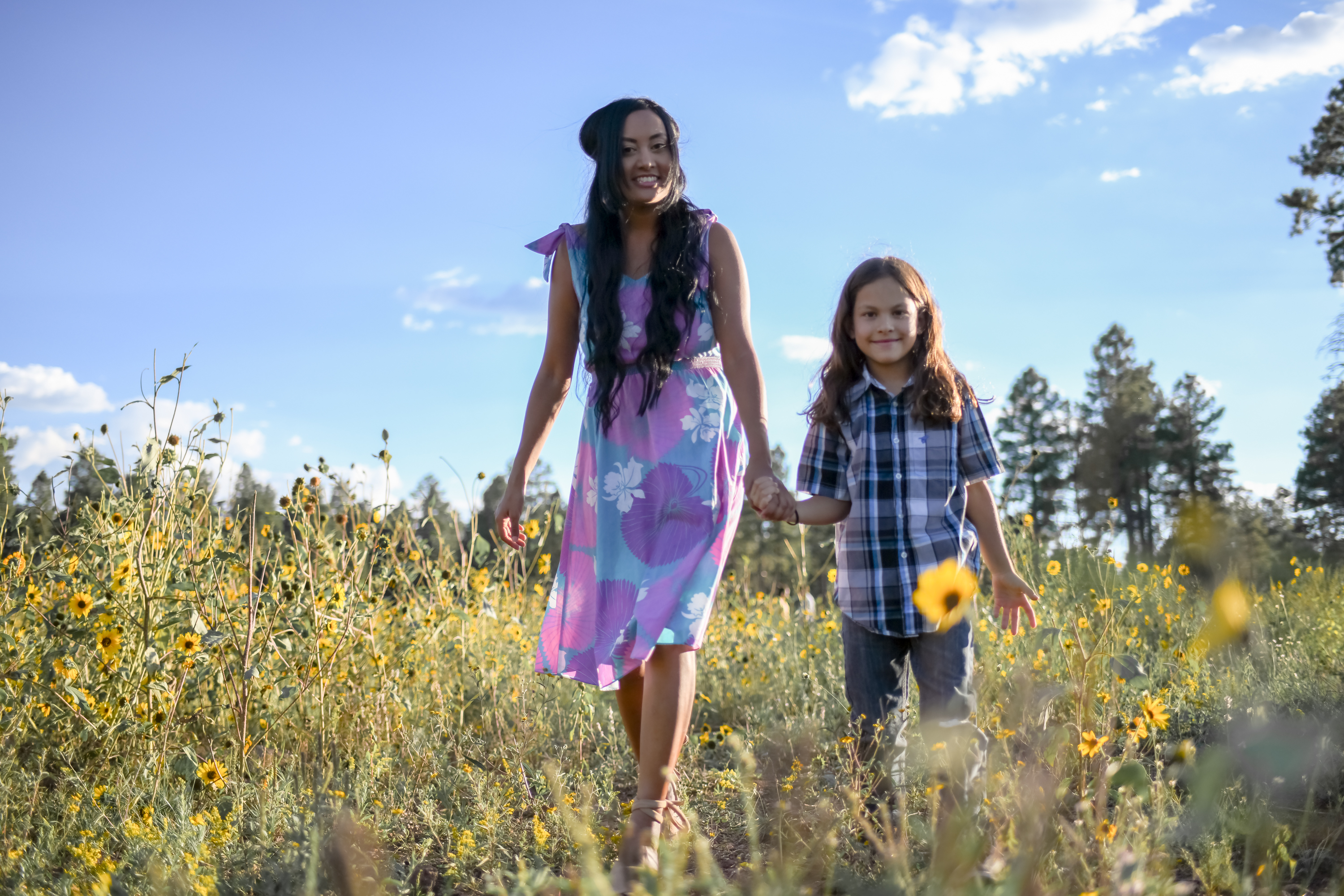 I have always wanted to take summer sunflower portrait photos in Flagstaff Arizona. On a good year, when the monsoons have been particularly productive, stands of yellow wildflowers pop up all over Flagstaff. A number of years ago, I took a young family’s portrait out by the Flagstaff Arizona sign on route 180. It was never quite what I wanted so I’m glad that I was able to recruit some friends for modeling in these gorgeous yellow flowers.