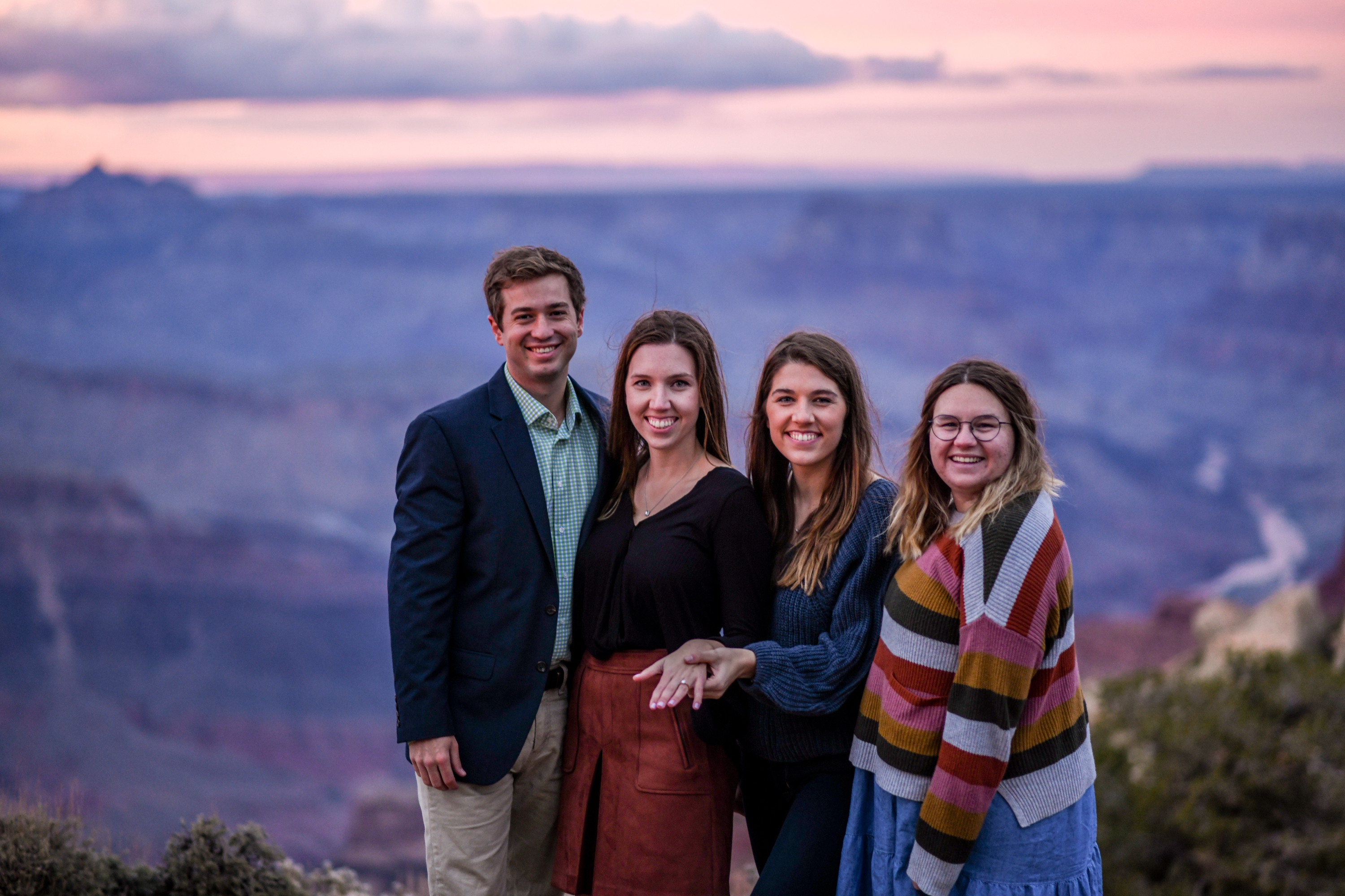I absolutely love taking National Park engagement photos, especially where I live at Grand Canyon. There really is no better backdrop than nature. These two geologists came out to Grand Canyon for a trip with their friends. After touring around for a couple of days, their friends help guide the couple into place for these really sweet photos. We all enjoyed the most beautiful sunset together and continued to take photos until long after the sun disappeared behind Grand Canyon North Rim.