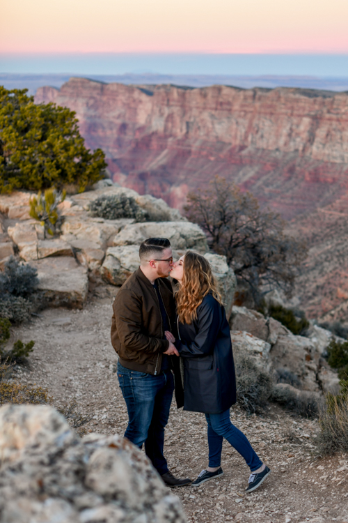 I really love taking these Grand Canyon engagement photos. Along the way, the proposer and I become penpals. There are so many questions and nervousness that goes into setting up and photographing an engagement proposal at Grand Canyon. The sun doesn’t aways set over the rim of the canyon and where it rises and falls changes everyday so I must become vigilant in “seeing the light” and knowing where the best locations are year-round. In 2016 the Park Service celebrated 100 years and with that they encouraged people to “Find your park” and boy did they. One of the biggest challenges in taking intimate photos and setting up important surprise proposals is finding a location that is quieter in visitation AND a location where the light is right. It’s getting harder and harder these days, but living here gives me an advantage and I think I’ve become quite the expert.