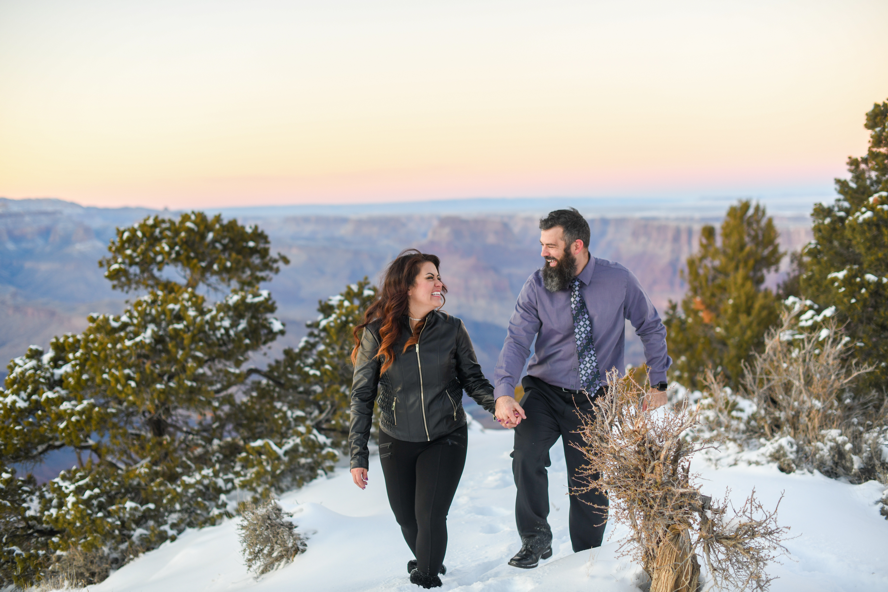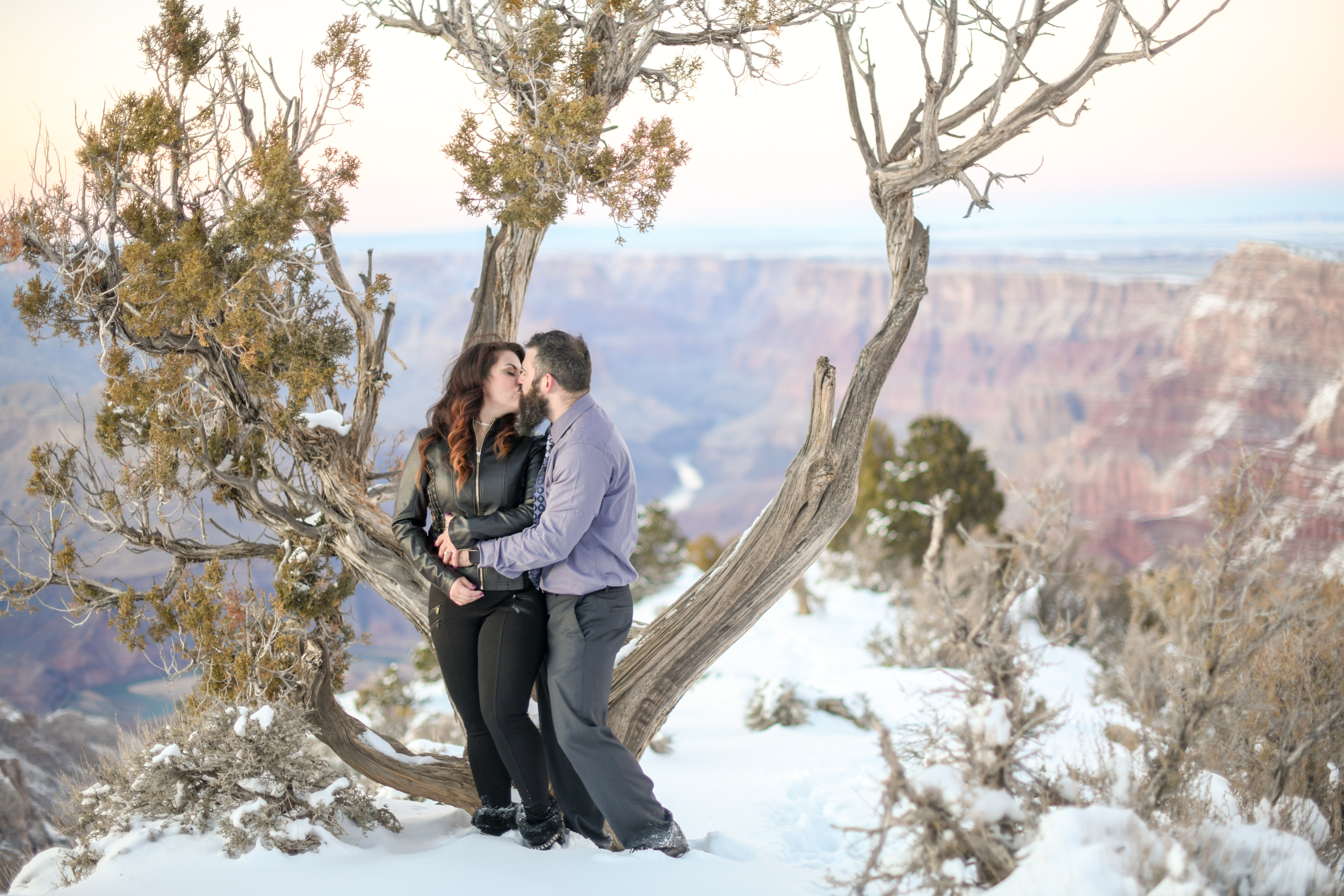 I took this gorgeous surprise engagement proposal at Grand Canyon January 2. I have been busy enjoying the winter lull and can’t believe I forgot to post these and two others. Better late than never! It was a stunning proposal and experiencing snow at Grand Canyon is truly magical. The snow here was very fresh and over a foot and a half! I was worried about whether or not we would be able to orchestrate the proposal on the rim of the canyon or if it might be too snowy for the couple and we would shoot at the railed area. I’m so glad for adventurous couples and these surprise adventure proposals, in the snow on the edge in this amazing national park. So much love! Congratulations, again and again!