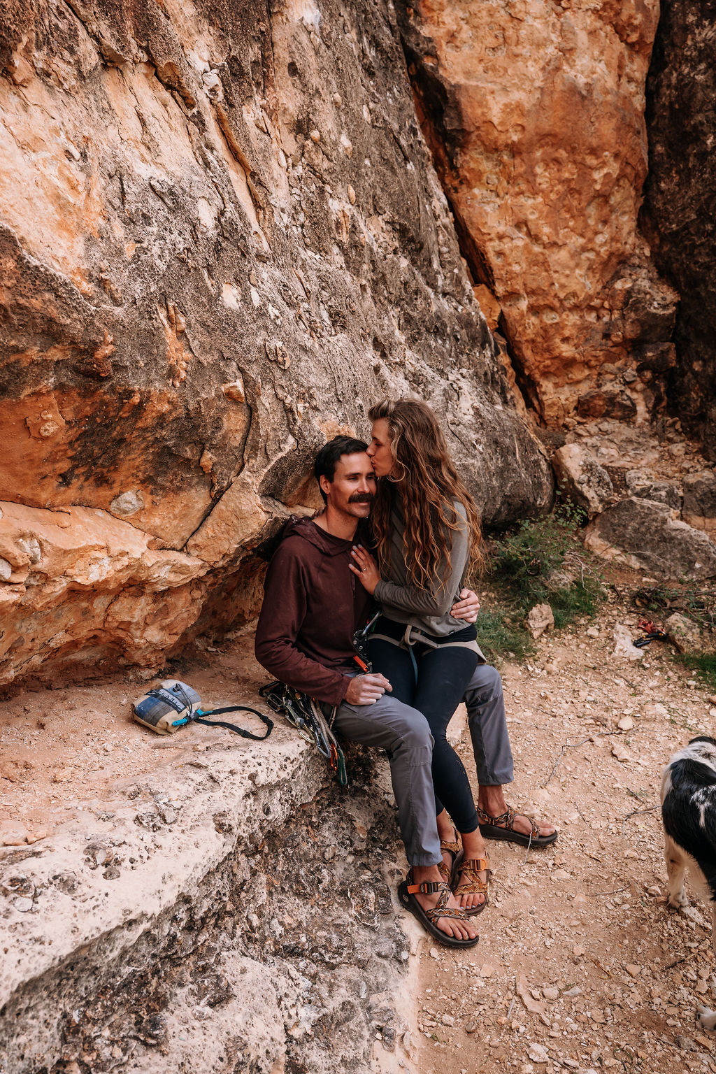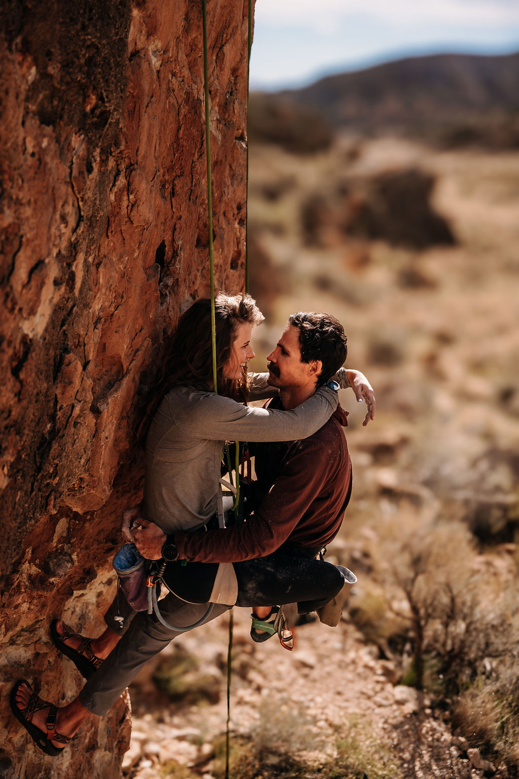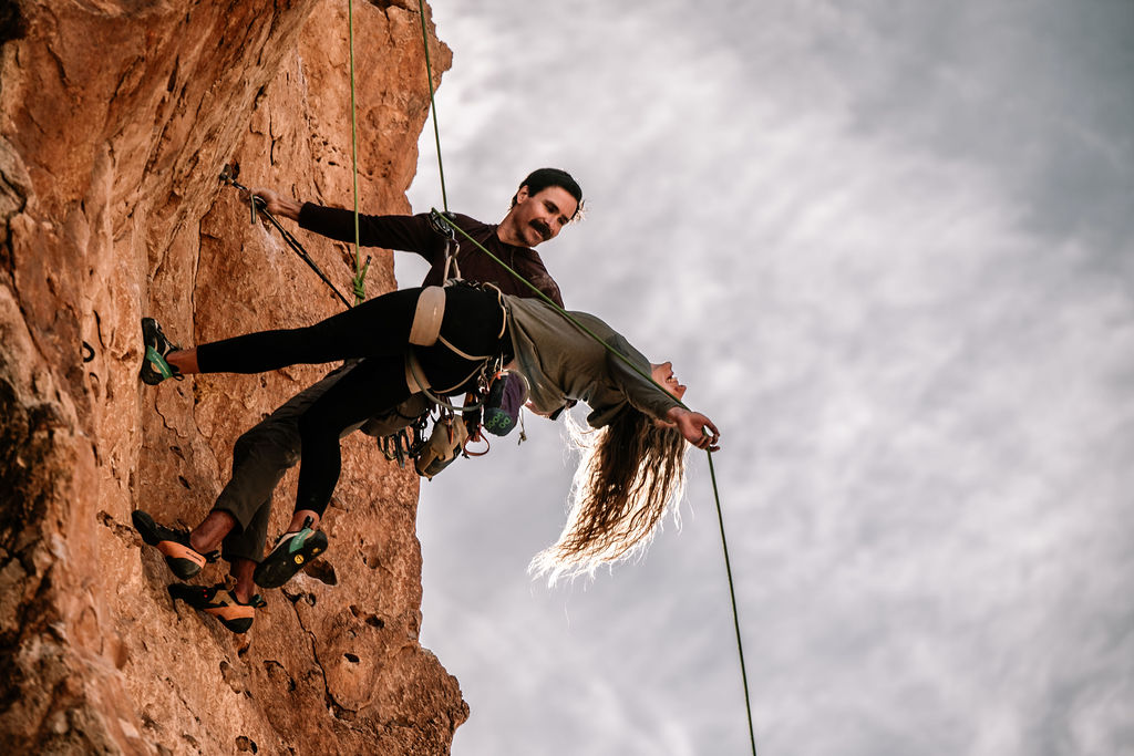 It can be slightly challenging to shoot a rock climbing adventure since one person is usually climbing while the other is belaying. This can make it tough to get close enough together while on the wall. For these engagement photos, we made sure to move the couple close together to show off the intimacy of their relationship.